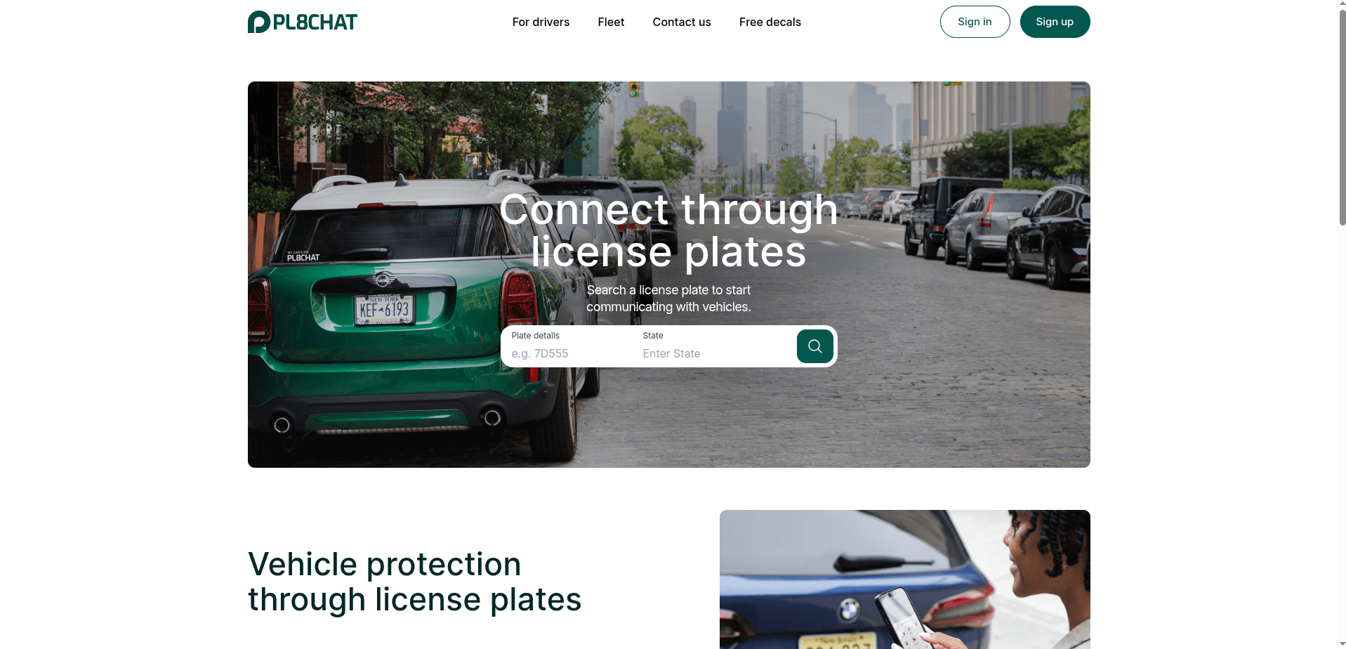 PL8CHAT is a vehicle communication platform that connects drivers, businesses, and bystanders through license plates. By entering a license plate on the platform or mobile app, users can send messages, report issues, or provide feedback about a vehicle, enabling safer roads and better fleet accountability